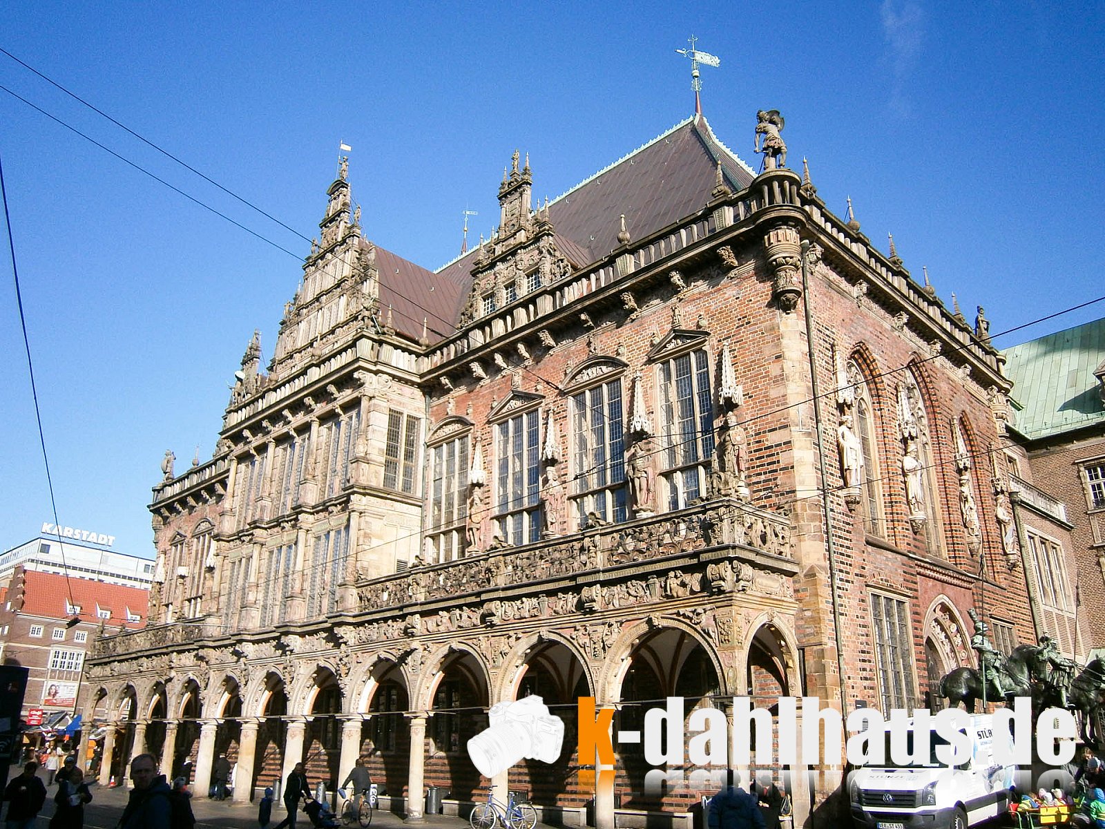 Vom Bahnhof gehen wir durch grüne Wallanlagen ins historische Zentrum von Bremen. Über den Domshof-Wochenmarkt hinweg sehen wir auf der einen Seite den St. Petri Dom und auf der anderen Seite können wir schon das Bremer Rathaus von der weniger bekannten Rückseite sehen. Wenn man nun um die Ecke geht, steht man auf dem Marktplatz mit dem Bremer Roland. Hier zeigt sich dann auch das Rathaus aus seiner bekannten Perspektive. In einer Ecke finden wir das Bremer Loch. Wirft man Geld hinein, so hört man die Bremer Stadtmusikanten. Sind die etwa unter die Erde gegangen? Da hätte ich doch bei der Wohnungssuche oder dem Wohnungsausbau helfen können. Wir Erdmännchen sind nämlich sehr gute Architekten. Leider haben wir bei unserem Besuch keine angetroffen.